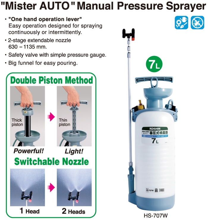 Koshin 7L “Mister Auto” Manual Garden Sprayer , Twin Heads